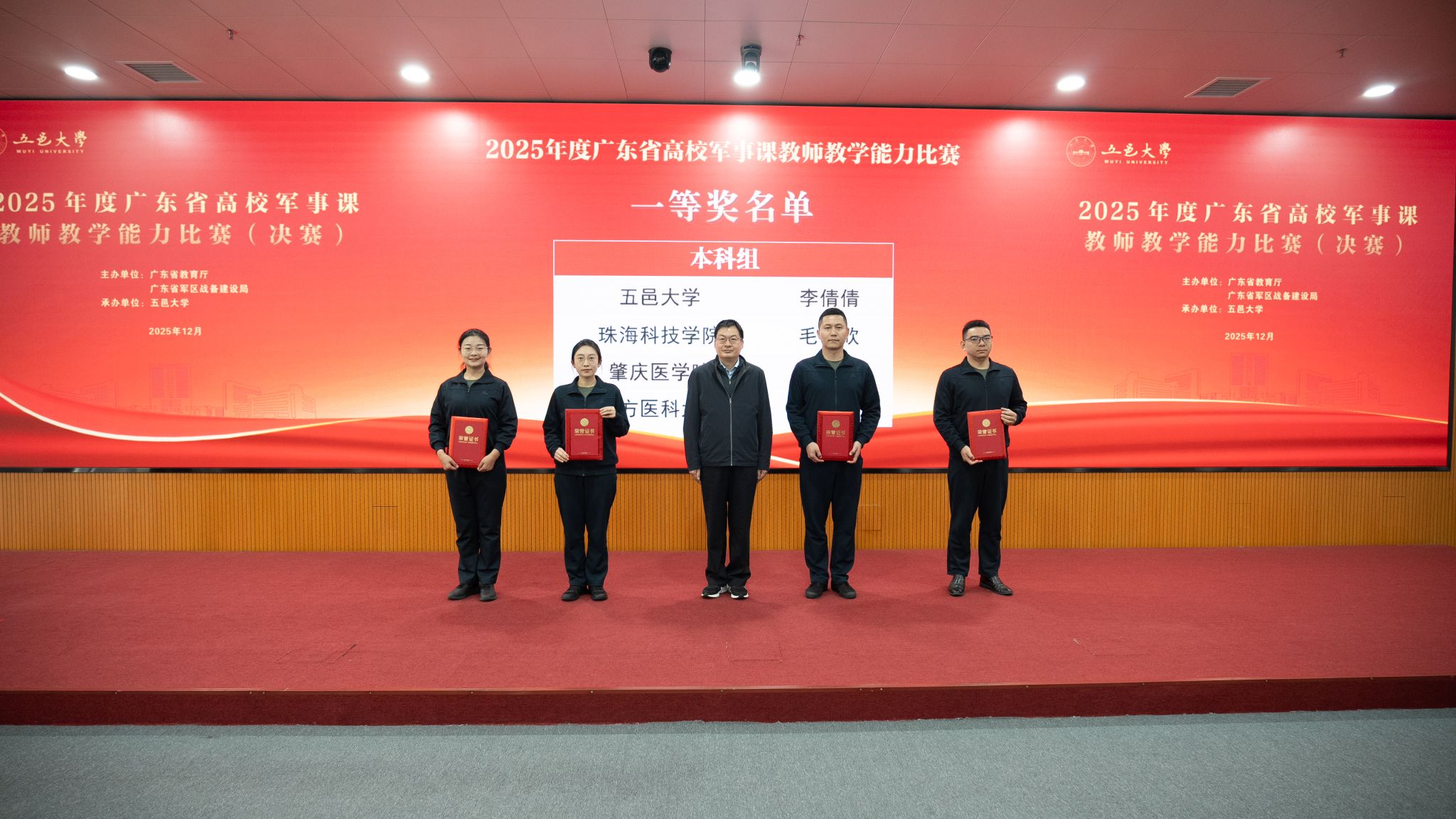 2025年12月5日,由广东省教育厅、广东省军区战备建设局主办,五邑大学承办的2025年度广东省高校军事课教师教学能力比赛(决赛)圆满落幕。我校军事课教师凭借扎实的专业功底、创新的教学设计与出色的现场表现,在全省入围决赛中脱颖而出,其中,我校李玉明老师获得比赛一等奖,我校青年教师彭莎莎获得优秀奖。